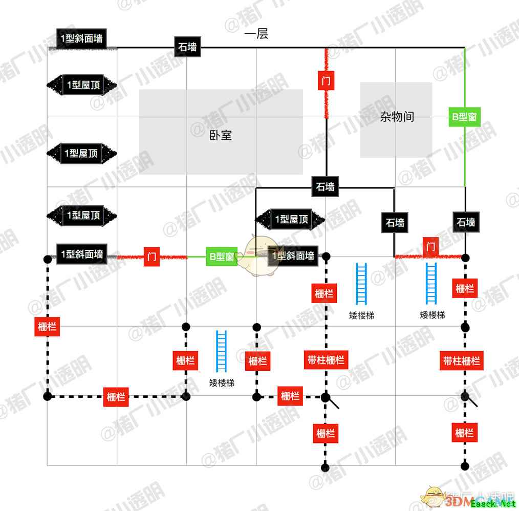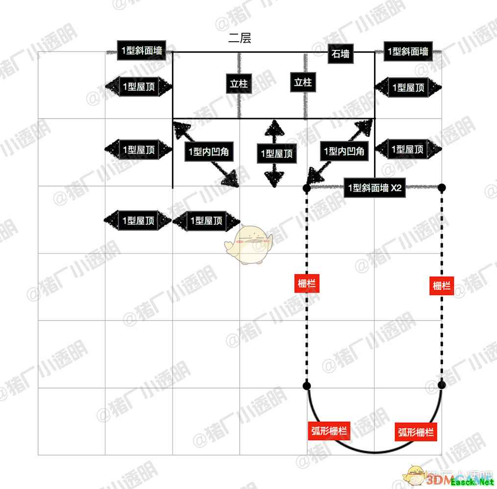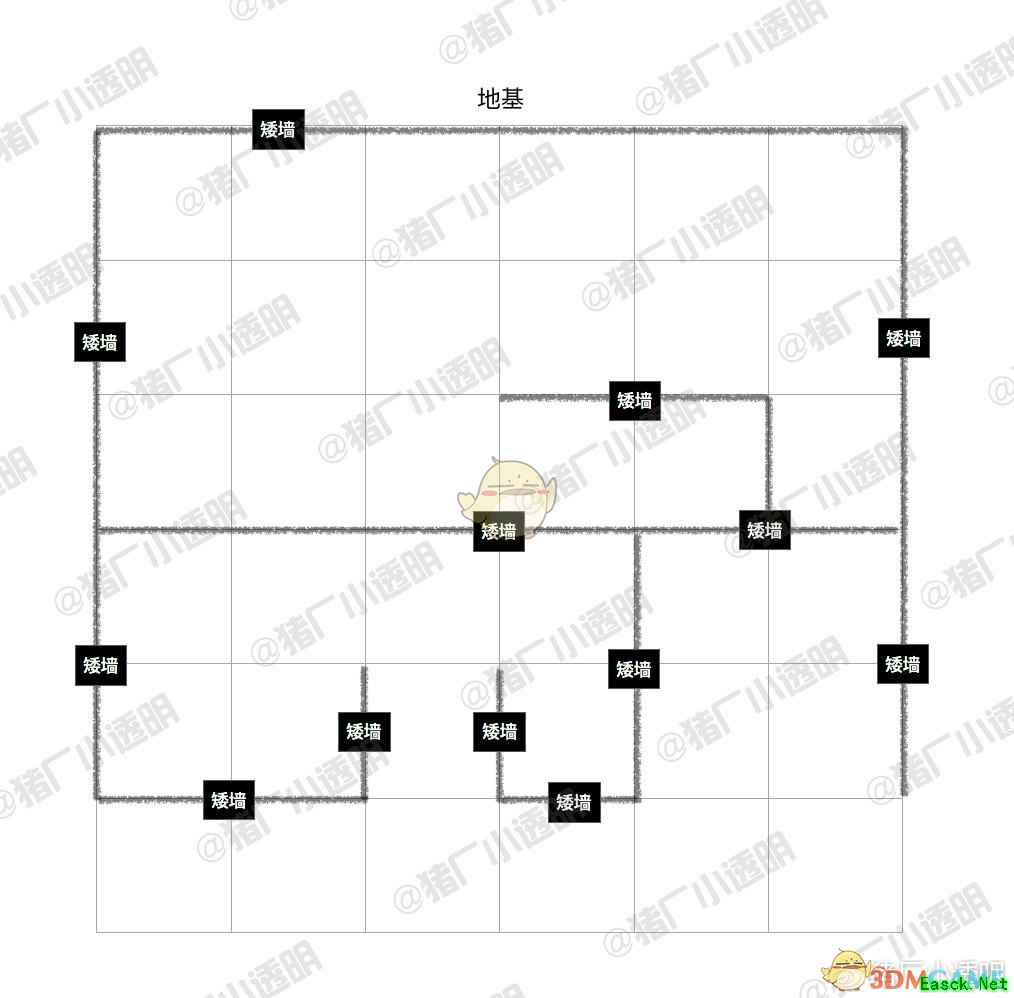 因为用矮墙做了地基抬高,所以我把地基部分单独拎出来做了一张图。 可能会有一点遗漏,被盖住了底下看不清楚,大家随机应变哈。