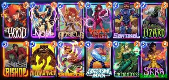 1.核心卡牌:塞拉、安吉拉、毕肖普、哨兵机器人、尚气、女巫师 2.打法说明:安吉拉和毕肖普作为两个养成形大哥各放置一路,第五回合打出塞拉后尽量保证我方第六回合是后手,第六回合试对手卡牌打出尚气、女巫师、吸收人、齐尔蒙格等争对卡牌破坏对手战力点数获得胜利。 3.Snap时机:第五回合控住后手,对手场面上有10战力以上大哥或者大量持续卡牌时可以果断snap。这套塞拉控制卡组玩起来往往有一种运筹帷幄,出奇制胜的快感,第六回合通常可以打出致命逆转。 |
