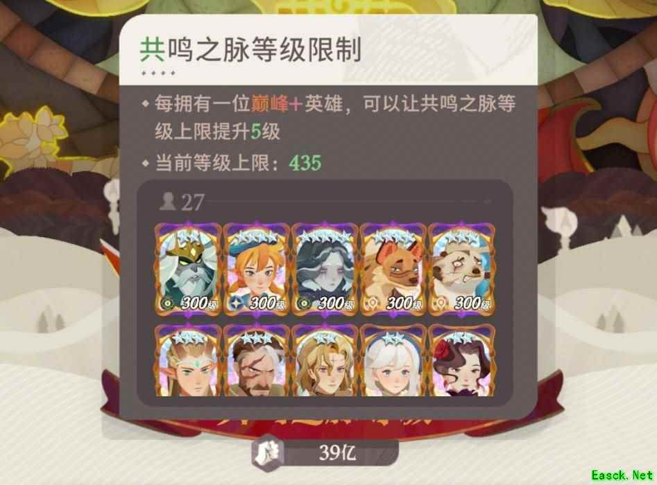 每拥有一位巅峰+英雄,可以让共鸣之脉等级上限提升5级。在下方也会贴心显示当前等级上限,以及你拥有的巅峰+英雄数量。