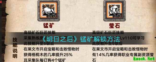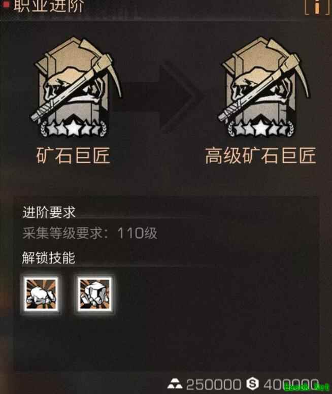 《明日之后》锰矿解锁方法采集熟练度等级到达110级后 挖矿工可消耗25万金条和40万技能点 从矿石巨匠进阶为高级矿石巨匠 职业进阶为高级矿石巨匠后 可解锁新技能锰矿、莹石