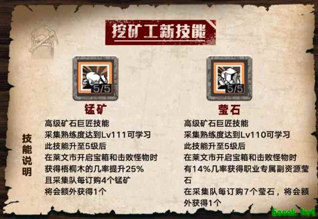 锰矿 高级矿石巨匠技能 采集熟练度达到Lv111可学习 此技能升至5级后 在莱文市开启宝箱和击败怪物时 获得梧桐木的几率提升25% 且采集队每订购4个锰矿 将会额外获得1个