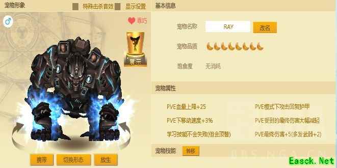 RAY是上个副本天山的八星宠物,建议先把天山的这只副本宠物拿到手,再刷末日副本。RAY拥有PVP,PVE双形态且自带双模式技能的八星宠物,尤其是PVE技能为群体范围伤害,尤其是攻击回复护甲这个属性,对于PVE模式来说,是非常非常有用的一个属性,护甲可以为我们减伤大部分的伤害,回复护甲等于持续增加了大额减伤,同时拥有12条双模式强大属性。 宠物:白玉灵虎