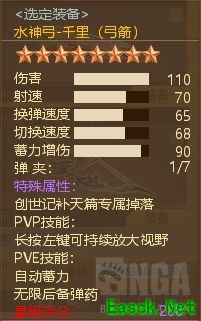 水神弓,PVP放大视野,PVE自动蓄力,无限后备弹药的属性使其拥有了独特的战场地位。PVP作为穿杨箭,不可穿墙。但是蓄力之后的水神弓伤害不俗。PVE中的伤害大概是1000-2000之间。
