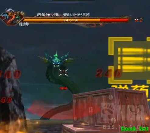 在BOSS血量下降到40%之后,绿龙就会出现。被绿龙的吐息和绿球攻击到,会给玩家施加中毒状态,持续掉血。 每条龙在攻击一段时间时候,会缩下去,进入虚弱状态,之后会再度出现。 这里有两种打法: 第一种:无毒刀。玩家可以在红龙和蓝龙中间,再利用圣女战旗的回血阵技能,进行输出,哪条龙出来打哪条即可。 第二种:有毒刀。持有毒刀的玩家,可以选择在中间石柱的弹药箱处,利用毒刀的大范围特性攻击怪物。这样一次性可以攻击到全部的五条龙。但是注意一点,玩家在这里的时候最好是面对金龙,因为金龙的技能会打掉玩家手持的武器。所以我们面对金龙的时候,看到金龙的吐息和金球袭来之后,可以快速切换投掷武器!对没错!BOSS的特效无法让我们丢掉投掷武器。等待技能过了之后,再切换毒刀进行输出。 建议:此种打法最好持有吸血套,不用担心血量问题。