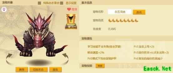 白虎宠物是玲珑篇第二关BOSS礼包的产物。PVE减伤.PVE攻击回甲可以使玩家获得持久战斗力。PVE伤害加成可以为玩家的输出带来强大支撑。同时还有血量上限的加成。强大的属性加成可以说是玩家们必得宠物之一。
