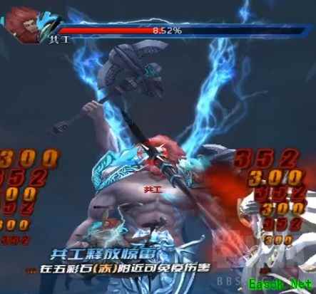 共工技能:惊雷。共工召唤惊雷攻击场景内。只有携带了红色石头的玩家周围会免疫惊雷伤害。