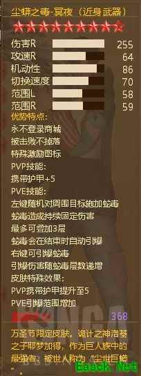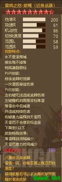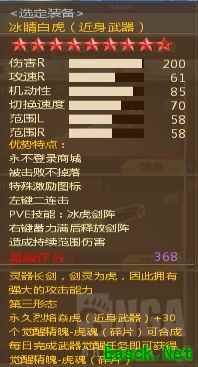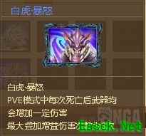更值得一提的是白虎的PVE技能,白虎·暴怒。 死亡后武器会增加一定伤害。最大叠加3次。玲珑篇的时候已经给大家讲过,这个技能只有死于副本机制,或者被怪物打死的时候才有效果。 基础近身武器推荐:白虎刀