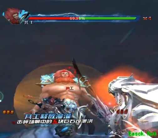 共工技能:怒涛。共工召唤水龙卷攻击玩家,此技能伤害较高。玩家需要注意血量。或者通过移动躲避。