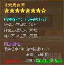 由于补天副本存在复活币的使用限制使挑战变得更加艰难。这里推荐几套PVE吸血装备,来帮助大家更好的通关副本。 子龙套装,现在可以通过铸造获得。 风尘三侠套装,英雄套装,现在偶尔会出现在限售中。 圣光心愿套装,PVE模式顶级套装。出现在暴击礼包中。 六,副本建议 女娲补天的故事和女娲造人的故事一样,都是中国人家喻户晓的神话传说之一。相传远古时代,天塌地陷,世间陷入巨大灾难,女娲不忍生灵受灾,于是炼五色神石补好天空,斩神鳌之足撑四极,平洪水杀猛兽,通阴阳除逆气,万灵得以安居。 而事情的起由则是水神共工战败于火神祝融,怒触不周山,撞断了不周山导致天地出现巨大灾难。 MAT的补天篇借用这个故事背景,玩家需要在补天篇中与共工极其部将进行战斗。直至获得最终奖励。 副本难度极大,建议玩家组队挑战,并配合好冰雷八宝雷的使用。 好了,话不多说下面为大家解读补天篇具体内容吧。 七,副本详解