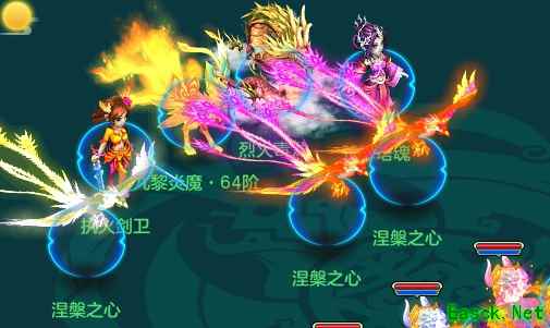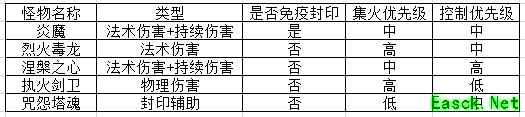 第三关: 本关的主要伤害来源是法术伤害以及持续性伤害。打法为封印两个涅槃之心,集火攻击烈火毒龙至将其击杀,随后集火执火剑卫。击杀完成后在封印咒怨塔魂,击杀涅槃之心。当场上剩下1个涅槃之心1个咒怨塔魂1个主怪时,可考虑先击杀主怪在击杀另外两个。