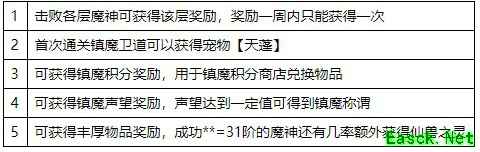 只要满足了以上这个条件那就可以到NPC:广成子 长安城(423.173)处报名参加了。镇魔卫道这活动一共分为六关,六组属性技能都不同的敌人需要击败。 一个活动对于大家来说最关心的一定是产出的奖励了那镇魔会有那些奖励呢。