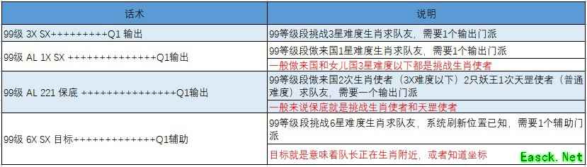 这些话术有几点需要注意 1、自身等级要符合队伍需求; 2、要留意挑战难度,随着星级的提高难度也会提高; 3、活动术语不要搞错(SX代表生肖); 4、限制条件要满足,自身属于什么类型的门派 当然组队时也可能没有限制条件,大家根据实际情况判断就好。 如果是要自己带队抢生肖,由于生肖会刷新在城镇内,所以可以设置一些飞行点辅助自己快速移动。