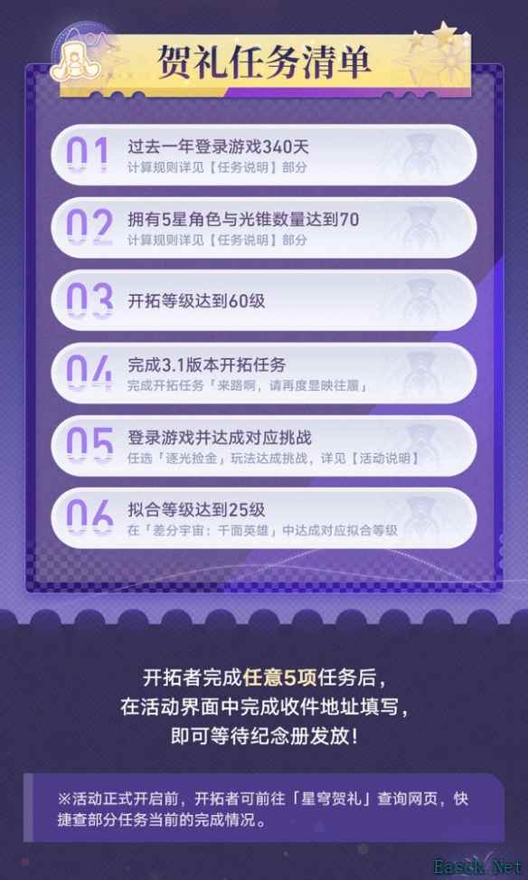 在崩坏星穹铁道游戏中,玩家能够通过周年庆的活动免费获得纪念册,第一阶段需要玩家完成纪念册的任务才能领取,很多玩家还不知道纪念册的任务逐光捡金怎么完成,下面小编就为大家带来崩坏星穹铁道纪念册逐光捡金攻略,感兴趣的玩家可以来了解一下。 崩坏星穹铁道纪念册逐光捡金任务完成 答:需要玩家登录游戏完成挑战。 1.在星穹贺礼活动中,玩家需要完成任意的贺礼任务才能获得免费纪念册,包括游戏中的逐光捡金玩法挑战。