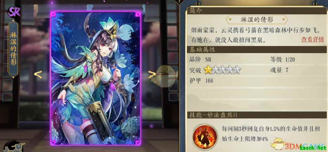 SR级逸事札——淋湿的倩影 逸事札的故事: 寂静的黑夜,明月挂在天边,与往常不同的是那浙淅沥沥的密雨。 一道倩影行走在林间,左手还持着弓,她叫云灵,是黑泉的守护者。 “怎么又下雨了?最讨厌下雨天了。”云灵嘟着嘴,但脚步却不曾停下。 雨打在树叶上、没入泥土中、淋在云灵的身上,无疑增强了巡逻的难度,让云灵更加的厌烦。 “得快点把周围巡逻完,这样我就能回小屋躲雨了。 云灵这样说着,脚下的速度又快了儿分,只是她在巡逻时却常常抬头看一眼天空。“要是没有下雨天就好了。”云灵这样想着。 基础属性(初始): 品级:SR 魂量:7 护甲:166 技能——妙法盎然11 每间隔3秒回复自身1.5%的生命值并且初始生命上限增加4%