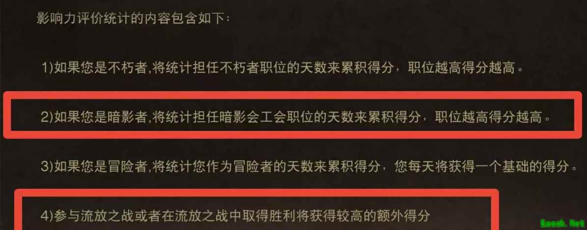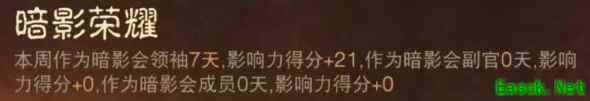 影响力分数计算规则:在公会天数*职位得分+流放胜利奖励分。 暗影会会长职位得分每天增加3分。
