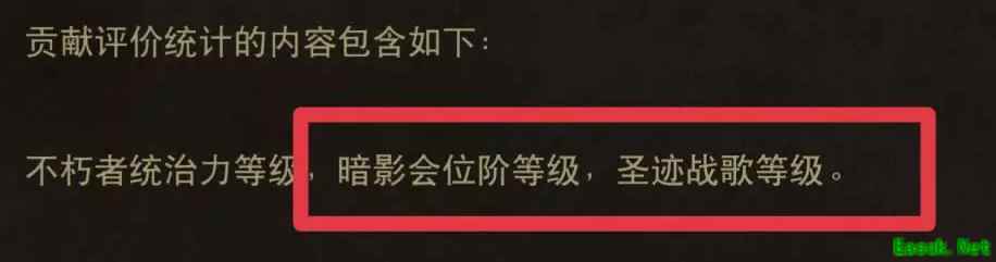 规则解释说明:统计在赛季内的总贡献度,并通过最终所在阵营排名来得出当前评价。 暗影会中影响贡献度评价的内容就是位阶等级和圣迹战歌等级。