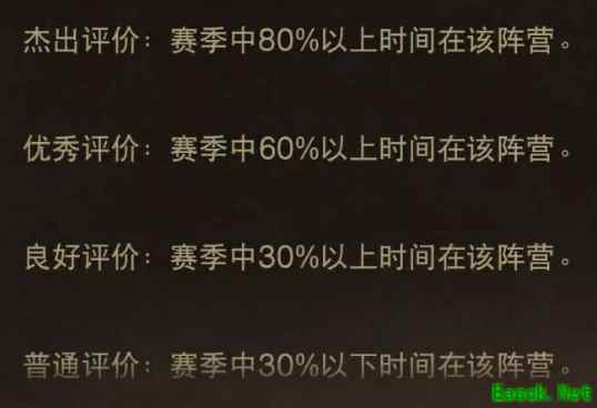 规则解释影响力评价:统计在本赛季中总得影响力,并通过最终所在阵营排名来得出当前评价。 暗影会中影响影响力评价的内容就是在暗影会担任工会职位的天数来积累积分和参与流放之战获得的额外积分。