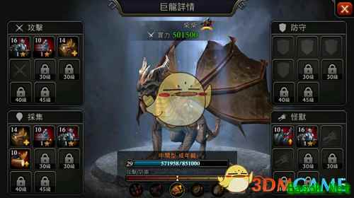三、龙魂进阶 当巨龙成长到十级之后会开启另一个重要的系统「龙魂」,化身为一个人形战士,在王国内的遗迹内挑战搜索,除了是另一个有趣的体验之外,同时也可以获得巨龙的技能石,不管是哪一种玩家都必须好好培养才能在征战中活下来。「龙魂」拥有「技能」和「天赋」两种增益;技能会随着等级上升自动开启,而「天赋」需消耗点数,同样靠升级来获取。