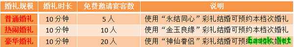 2、预约婚礼&邀请宾客 新人提亲成功后,可以通过【预约婚礼】界面选择婚礼规模以及婚礼时间 婚礼规模