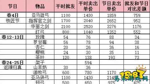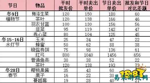菜市场模拟器季节与节日的变化会影响到物品出售的价格,如何在不同的季节争取到最高的效益呢?本次攻略带来季节节日价格对物品售价的影响一览。 以下内容由小黑盒用户黑熊熊i分享。 鱼类价格表 【冬季总结】每天只卖:威士忌、葡萄酒、帕尔马干酪、鱿鱼。月入300W不是梦。每天营业额能达到14W,除了日常开销进货,剩余的钱全部用来种树囤蜂箱,蜂箱先堆着不用摆出来,树不要种太密,留出摆蜂箱的位置。 冬季节日价格变化 【春季总结】春季除了冬季蔬菜涨价,很多物品都掉价严重,根本卖不上价格,营业额掉到每天6W-8W左右。还好冬季种满了树,铺满了蜂箱。已经放弃牛棚、种菜、温室、钓鱼,很累,每天一睁眼只收果树,蜂蜜,浇水,抓蜂蜜,铺蜂箱都能累死。。。 春季节日价格变化 每天蜂蜜能卖出4-6W,随着产量越来越多,2天蜂蜜卖了25W+,到目前声望维持在184,装饰买的差不多,没有用钱的地方了。 夏季节日价格变化 春季过完,余钱70W+,还在大量投资种树和蜂箱,春季不走蜂蜜流,只能卖鱼补贴,天天出去钓鱼,日子会紧巴巴。一个月雇员费4万5、房租41万、维护费47万,时不时扣税都要16W,卖货219W扣除这些成本105万,所剩无几。蜂蜜流果然是最好的赚钱路数。 |
