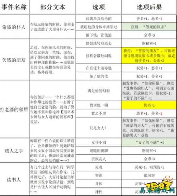 苏丹的游戏中随机事件属于每次游戏过程的随机要素,针对玩家对随机事件的不同选项,也会有不同的惩罚或奖励效果,那么随机事件的选项都会造成什么效果呢?本次攻略为大家分享随机事件中各个选项所带来的效果一览。 以下内容由小黑盒用户滟朦分享。 灰底:可销苏丹卡 黄底:加侠名 蓝底:有属性要求/需检测属性 浅绿底:获得比较特殊的物品/加成 事件名称速找: p1:偷盗的仆人;欠钱的朋友;打老婆的邻居;贼人之手;读书人 p2:祖传的。。。;妻子的梦;以神之名;躲雨的人;行脚僧 p3:喝醉的同僚;商队投资;午夜美人;神秘的符号;骗子登门 p4:邻居投诉;苏丹的金苹果;贸易路线;吉兆;两个丈夫;奇异的机械 p5:不敬之书;河流的方向;苏丹的梦;苦水;讽刺的歌;蛇鼠一窝 p6:诡异的游戏;禁忌的画册;懈怠的士兵;着火的宅子;询问品级;分羊 p7:染血的赌约;商人之争;神的栖所 p8:撤回的献祭;你的心中有魔鬼 p9:寄养子之死;大臣陷害 |
