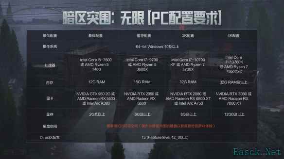 暗区突围无限游戏即将上线,作为一款FPS游戏,玩家可以体验到超级硬核了战斗乐趣,玩家需要准备好充足的空间才能进行游戏,很多玩家还不知道游戏中占用的内存有多少,下面小编就为大家带来暗区突围无限占用内存说明,感兴趣的玩家可以来了解一下。 暗区突围无限内存占有介绍 答:最低配置:12G内存和80G硬盘空间。 1.暗区突围无限最低配置需要12G内存和80G硬盘空间,固态硬盘可以让玩家获得更好的游戏体验。 2.目前游戏的最低配置是:Window10操作系统、12G内存及FeatureLevel 12_0 DirectX版本。