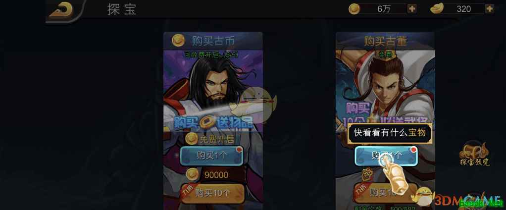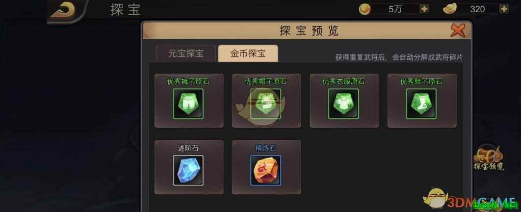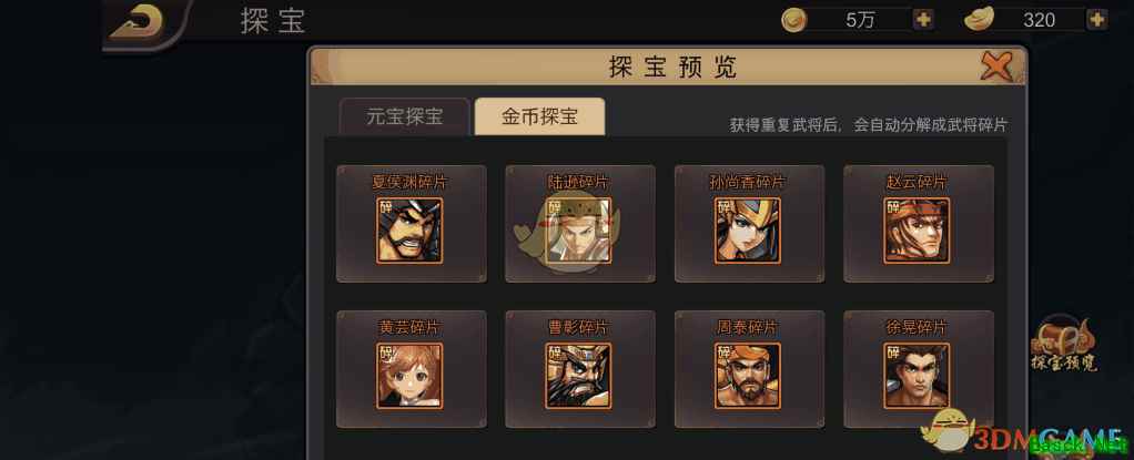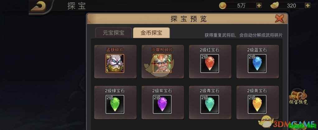 在金币探宝中,1000金币抽取一次,可随机获得一件奖励物品,包括武将碎片、关卡道具、初级宝石等等。玩家也可直接购买10个古币,一次性获得大量物品。 每隔10分钟,金币探宝可免费进行一次,一天中最多可免费探宝5次; 金币探宝可获得内容: