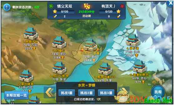 帮会攻城战 1、活动开启和参与条件: a、活动开启时间为:周二和周五0点开启 b、攻城战开打时间为:14:30 分。 c、攻城战攻打时间为24小时,开启24小时后结算攻城战帮会胜负奖励。第二天中午14:30分结算。 d、参与条件: 1)帮会升级2级 2)活跃人数达到40人 3)入帮时间超过1天 4)等级达到40级 2.、 攻城规则: 玩家城池:一个玩家为一个城池单位。 a、根据帮会成员的竞技场杯数排序,从杯数高到杯数低抽取玩家成为城池单位。 b、每个城堡分为3个星级,每个星级的难度不一样。 c、玩家可自行选择攻击哪个城堡和星级难度。 d、每个玩家只有2次攻打城堡的机会。 e、攻击的星级越高,奖励越高。 f、不管升级还是失败,都能获得丰厚的物品奖励。 3、 帮会攻城战胜负结算规则: a、攻城战攻打后24小时后,根据帮会的总星数来决定胜负。 b、结算后可奖励:帮会工资、帮会资金和帮会礼盒。 |