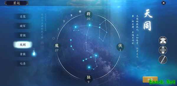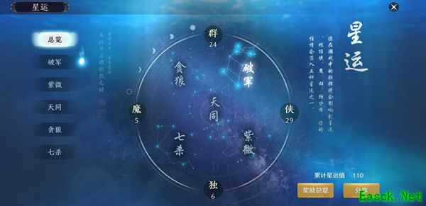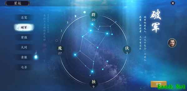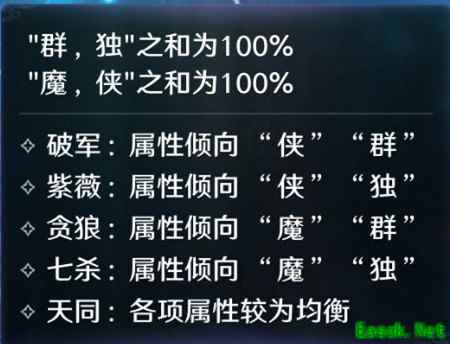 群 玩家在游戏中选择那些为国为天下的选项就会增加,并且玩家可以通过参与团战战场类的玩法有几率获得群属性。 侠 玩家在游戏中选择那些为民和仗义的选项就会增加,并且玩家可以通过镖师玩法有几率获得侠属性 独 玩家在游戏中选择那些以自我为中心和恶作剧的选项就会增加,并且玩家可以通过游侠玩法有几率获得独属性 魔 玩家在游戏中选择那些恶的选项就会增加,并且玩家可以通过悬眼玩法有几率获得魔属性 五星运破军 破军相照之人,以天下为念,行侠义之事,所求者,天下有道也。从这句话就可以得出破军被侠,群两个属性所影响。破军相照之人可以为叶知秋逆天改命。