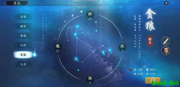 贪狼 贪狼相照之人,以天下为妄,行狂邪之事,所求者,天下之权也。从这句话就可以得出贪婪受群,魔两属性影响。贪狼星运对悬眼职业就加成效果并且贪狼相照之人可为叶知秋逆天改命。