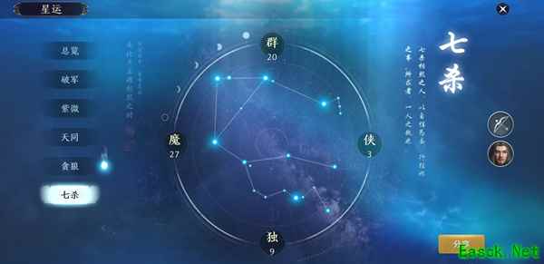 七杀 七杀相照之人,以自性为妄,行狂邪之事,所求者,一人之执也。从这句话就可以得出七杀受独,魔两属性影响。贪狼星运对游侠职业就加成效果并且贪狼相照之人可为叶知秋逆天改命。