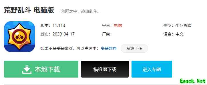 二,搜索并安装《荒野乱斗》 1、搜索《荒野乱斗》:进入雷电模拟器后,点击桌面上的黄色图标:「雷电游戏中心」,在搜索框中搜索《荒野乱斗》即可,找到游戏点击下载。 2、《荒野乱斗》也可选择官网下载:下载地址 下载完成后,将apk文件拖入雷电模拟器,自动安装完成,点开游戏就可以玩了。