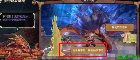 1、问题:突然钻出一根触手猛烈【拍打地面】,碎裂的地板下是熔岩? 情况:突然出现一根触手【拍打地面】 答案:立即远离该区域; 2、问题:宫殿里出现了一根【蠕动触手】,似乎并没有攻击我们?糟了,是精神控制! 情况:屏幕左侧出现了一个【蠕动触手】 答案:立刻转火击杀触手; 3、问题:罗特斯吸水,同时出现触手是黑色气泡攻击的提示,需要快速击杀触手后在其残骸下方躲避黑色气泡。 情况:头上的【氧气进度条】即将耗尽 答案:踩地上冒泡的洞口;