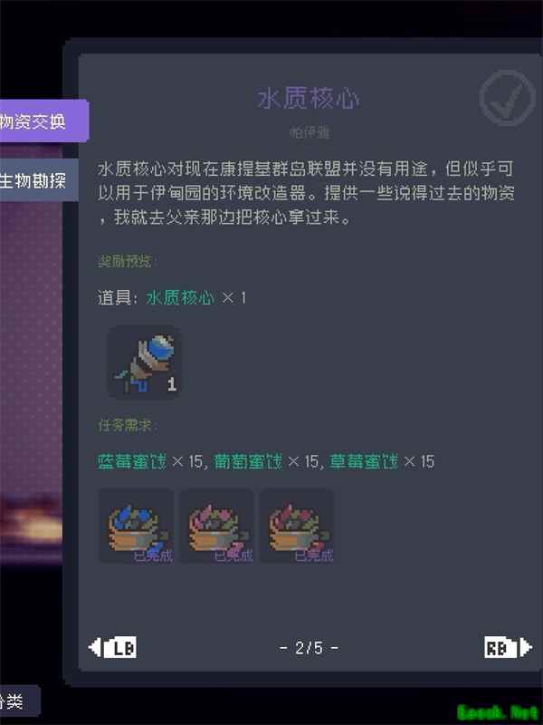 【生物勘探】 生物勘探的四个任务全都是提交相关的鱼类。 第一、三个任务的鱼类可以「三级改造」之前完成。 第二个任务的鱼类,需要环境改造器「三级改造」之后才会出现。 需要注意的是,每种鱼类出现的时间不同,也是需要提前准备的! 【环境改造器 三级改造】除开第一个零件之外,另外两个零件分别是上述任务的「水质核心」,和湿地解锁的「莲花原形」 所以基本上要做完【生物勘探】是需要通关主线剧情的。