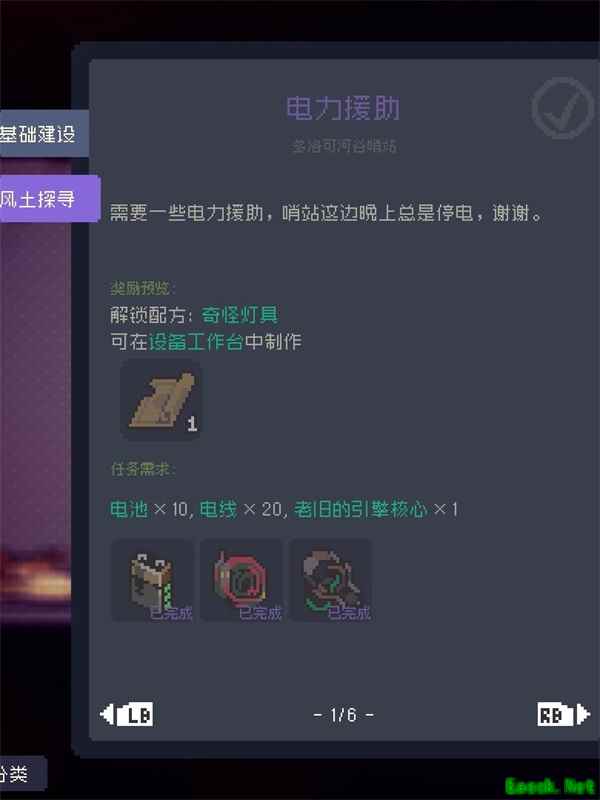 【公交车站】可以通过车票在各个公交车站之间来回,没有车票也没关系,车票30块一张。中后期基本以上依靠车站进行跑图,所以优先解锁! 【缆车(矿区)】中期在资源紧缺的情况下(湿地并未开放/湿地打不过),矿区可以为你提供一点资源的支持(矿区上方靠近墙壁的小台阶处有一个隐藏入口,里面有矿石) 最后一个任务是大型集装箱的蓝图(一开始会直接给你一个大型集装箱,需要建造可以去找杰拉德) 【大型集装箱】在集装箱内种植农作物、铺建设施,不会受到外界天气的影响,但会受季节影响,因此可以在种植生长期较长的农作物,或者比较重要的建筑设施。 ——【风土探寻】—— 基本上给的都是一些图纸和食谱,有需要就解锁。
