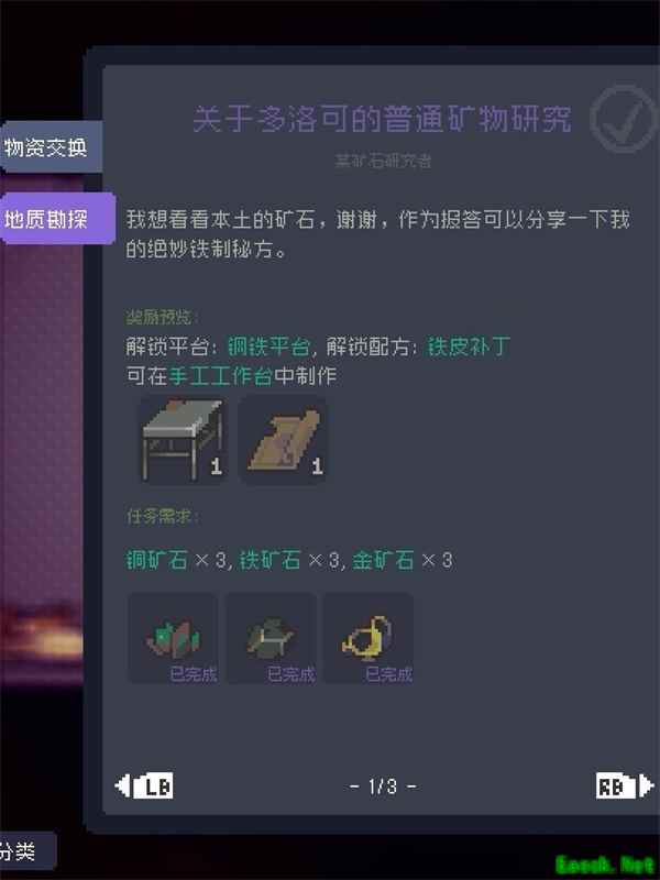 【矿石收集】 第一个任务是需要你收集三种不同的矿石,铜矿石和铁矿石比较容易获取,重点在于金矿石。 「金矿石」的获取途径:可以在梅林的铁匠坊中获取;或者在湿地矿石区获取;或者通过烘干黄金闪亮鱼获取。