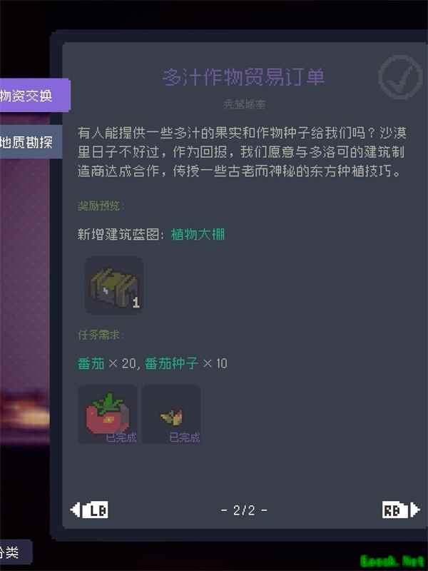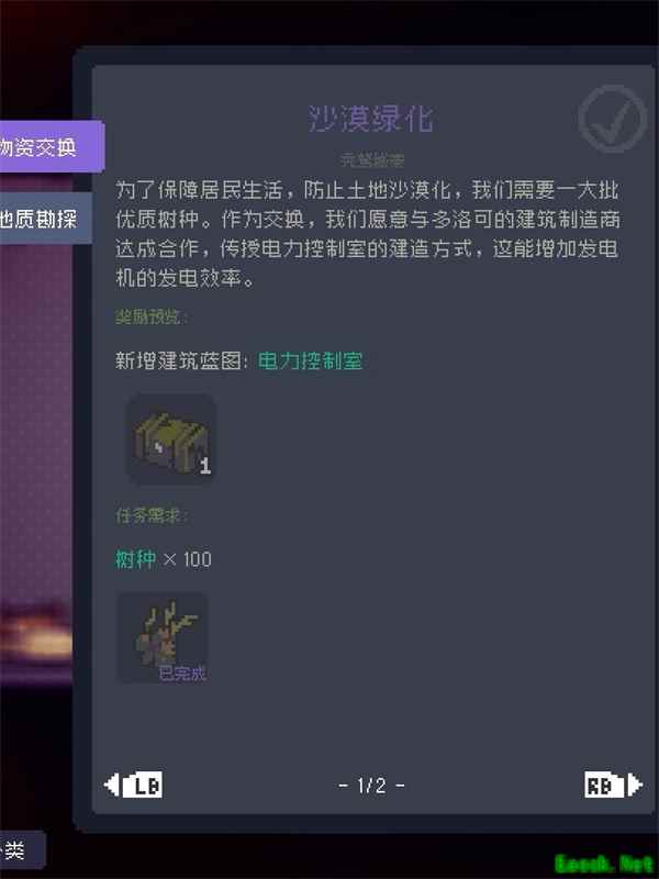 未入驻之前的物资交换任务是做不了的,你需要至少完成两个【地质勘探】的任务之后即可广播夏洛克入驻! 【沙漠绿化】 这个任务需要收集100个树种,在前期就需要开始积累,因为数种并不像木树一样随处可见,是概率掉落的,所以别到要开始做任务才开始收集 解锁的建筑蓝图是「电力控制室」,这是一个对于发电强度有着显著提高的建筑,你可以将发电机建造在里边,会提升发电量!