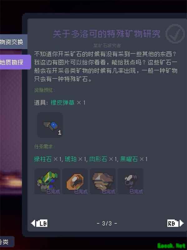 【特殊矿石】 这个任务需要你收集「绿柱石」「琥珀」「肉形石」和「黑曜石」 「绿柱石」挖掘铜矿概率获取。「莲花池女巫」、「河谷商人」同样有售卖。 「琥珀」挖掘煤炭概率获取。 「肉形石」挖掘普通石头概率获取。 「黑曜石」挖掘金矿概率获取。「莉卡」有概率售卖。 「莉卡」每周日会刷新在码头处,可以和她进行简单的交易,会售卖黑曜石!看到了就买!看到了就买!看到了就买!