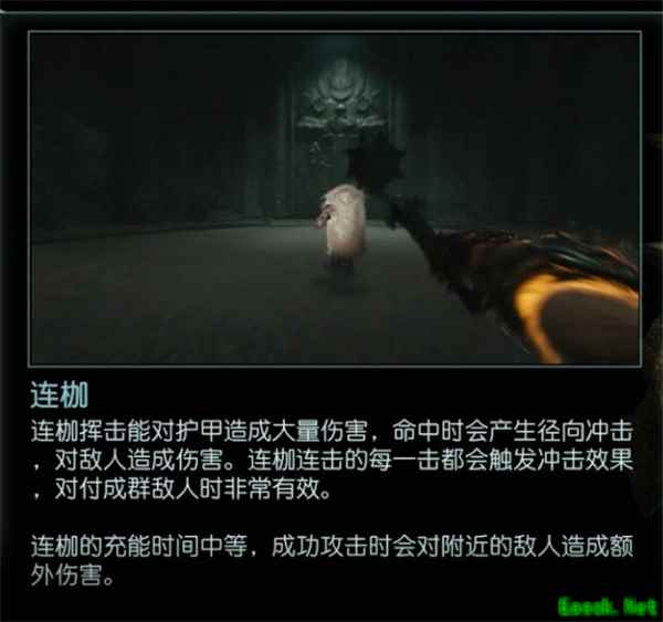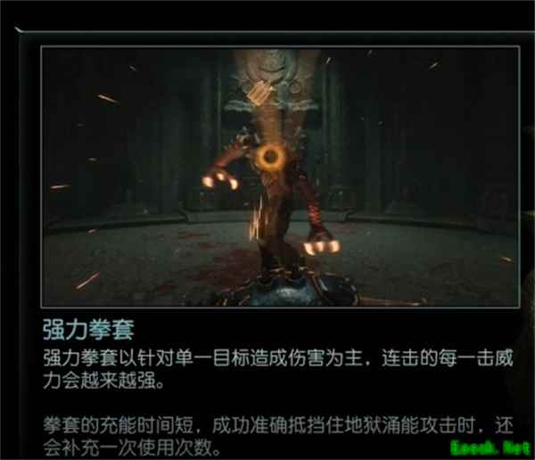 链接技能: 终结技:增加强力拳套连击最后一击的伤害。 决斗者:准确抵挡住地狱涌能攻击时,能加速补充近战武器的使用次数。 震荡:强力拳套连击的第一击施加电击。被电击影响的恶魔受到的伤害增加。 安可:强力拳套连击新增第4击。只有在准确抵挡住攻击后获得一次近战使用次数时,才能使出这额外的一击。 连枷 效果: 连枷挥击能对护甲造成大量伤害,命中时会产生径向冲击对敌人造成伤害。连枷连击的每一击都会触发冲击效果对付成群敌人时非常有效。 连枷的充能时间中等,成功攻击时会对附近的敌人造成额外伤害。