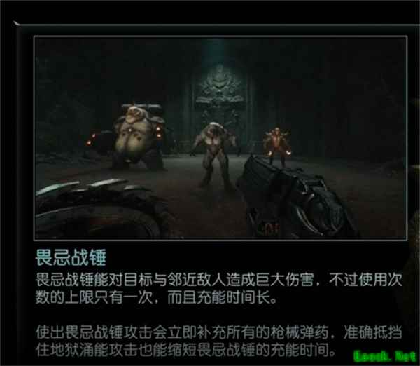链接技能: 调节:连枷充能次数的时间缩短五秒。 点燃:被连枷击中的恶魔会燃烧并掉落护甲。 共振:连枷攻击对金属盾牌与护甲造成额外伤害,这些攻击还会产生护甲碎片。 烈火吞噬:每次连枷攻击都会使附近的恶魔燃烧,并掉落护甲。 畏忌战锤 效果: 畏忌战锤能对目标与邻近敌人造成巨大伤害,不过使用次数的上限只有一次,而且充能时间长。 使出畏忌战锤攻击会立即补充所有的枪械弹药,准确抵挡住地狱涌能攻击也能缩短畏忌战锤的充能时间。