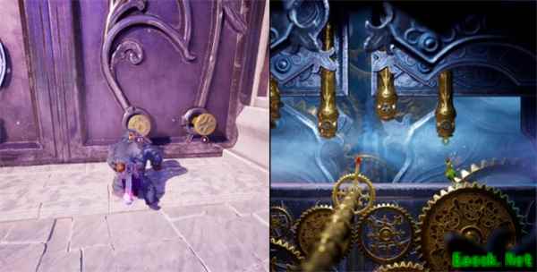 在双人合作冒险游戏双影奇境中,第三章中进入殿堂需要用钥匙开大门,部分玩家不知道这个大门开锁谜题应该怎么解,下面就为大家带来双影奇境中第三章大门开锁的解谜攻略分享,有需要的玩家可以参考。 双影奇境第三章大门怎么开 1、在宫殿门口这里先将左后方的屏障破坏使其可以生成风道。 2、然后让另一个玩家变成仙女飞进门内部。 3、先让仙女将中间的指针向左摆动,再让猩猩,从左到右一次门口的按钮。