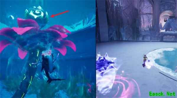 BOSS被砸之后头会垂到地上陷入硬直,水里的人要及时出来攻击BOSS头顶的珍珠,硬直起身后BOSS会封住池塘。