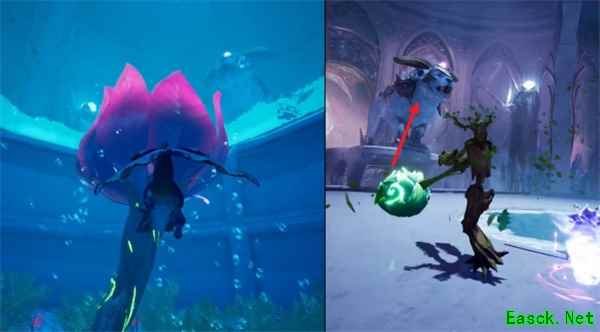 在躲避技能的同时需要一人变身,潜到中间水池里把绿色果实顶上来;