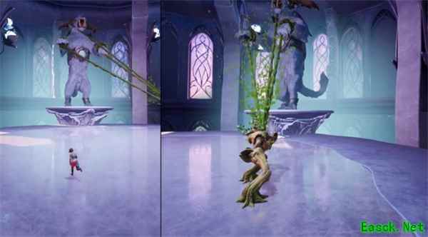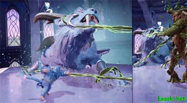 BOSS起身但站立不动时变成树人缠住它的手,把它的头拉到地上;另一位角色变成猿胖揍BOSS的大脸巴子。