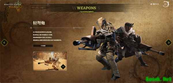武器介绍 轻弩炮 从中距离发射弹药攻击的武器。 机动性高,擅长快速射击与回避。 消耗速射能量可进行多次射击。 速射能量会随时间推移或射击命中而逐渐回复。