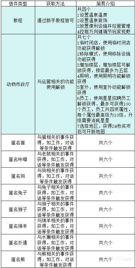 在游戏《线条小狗:动物温泉》中,信件是玩家与小狗之间重要的沟通方式,它们对玩家有深远的影响。 首先,信件提供了角色互动的机会,让玩家更深入地了解小狗的内心世界,从而更好地理解小狗的行为和决策。每封信件都可能揭示小狗的独特故事和情感,增加了游戏的剧情深度。 其次,信件也为玩家提供了收集和展示的乐趣。收集所有的信件是游戏的一个重要目标,这个过程可以带来成就感和满足感。收集到的信件也可以用于后续的奖励和成就解锁,进一步增强了游戏的可玩性和持续性。 再者,信件也可能对游戏进程产生影响。有些信件可能会触发特殊事件或改变游戏结局,这需要玩家仔细阅读每封信,才能更好地理解游戏世界并影响游戏进程。 最后,信件也为玩家提供了一种情感连接的方式。通过阅读小狗的信件,玩家可以感受到小狗的喜怒哀乐,从而更深入地理解和照顾它。这种情感连接增强了游戏的社交性和人性化元素。 总的来说,信件是《线条小狗:动物温泉》中一个非常有特色的元素,它为玩家提供了丰富的游戏体验,包括剧情探索、收集乐趣、影响游戏进程以及情感连接。 线条小狗:动物温泉中信件在完成新手教程后或者使用经营功能就会解锁了,信件的解锁与否与星星奖励挂钩,本次为大家分享线条小狗中信件全集一览。 以下内容由小黑盒用户PHX-祥分享。 信件 完成新手教程或使用经营类功能可解锁获得,或与各种动物有关的随机事件信件,信件解锁成功可获得星星奖励 |