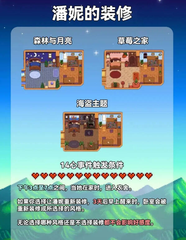 在《星露谷物语》中,可婚角色14心隐藏物品的获取方法有以下两种: 第一种是通过每天送礼物来提升好感度,当好感度达到14个心的时候,可以在下午两点去羊驼商人那里买到隐藏物品。另一种是通过完成一个任务来获得,玩家需要去每天收集果子,然后送到女巫那里,一段时间后她就会要求玩家帮她修复她的地下室,在地下室最深处就可以找到隐藏物品。 对于玩家来说,获得这个隐藏物品后,女巫会要求玩家和她结婚,如果愿意的话就可以结婚并获得奖励。如果玩家婉拒,女巫会赠予玩家一个魔法瓶子,可以开启出传奇物品。除此之外,与女巫的好感度提升后,玩家可以提前知道游戏中很多秘密,比如某些地方可以挖到什么传奇物品。同时,女巫的羊驼还可以产奶,这是游戏中最好的食物,可以吸引动物产出的更好的奶。 以上就是《星露谷物语》中可婚角色好感度达到14个心时获取隐藏物品的方法以及该物品的影响。游戏中还有许多其他的好感度任务和奖励,玩家可以在游戏中探索和发现更多有趣的玩法。 星露谷物语中14心剧情物品需要与好感npc达到指定的好感后完成相对应的剧情任务方可获取,这种隐藏物品只能获得一个,因此玩家必须做出抉择,本次为大家分享星露谷物语种14心好感剧情的物品获取方法,及14星好感度任务攻略。 以下内容由小黑盒用户玩家80993488分享。 今天给大家分享下《星露谷物语》可婚角色14心剧情可获得物品! 星露谷一些角色过完剧情是会给物品的,如山姆、艾米丽、潘妮,莉亚那个雕像6心就可以搞到什么时候都能拿,这三位只能14心剧情拿,也就让你必须作出抉择! 艾米丽: 山姆: 潘妮: |
