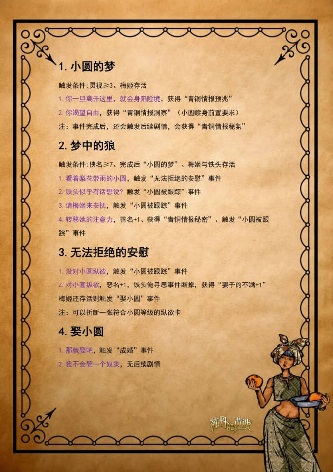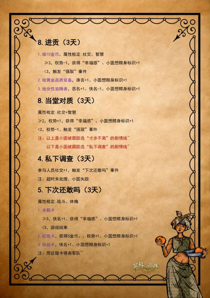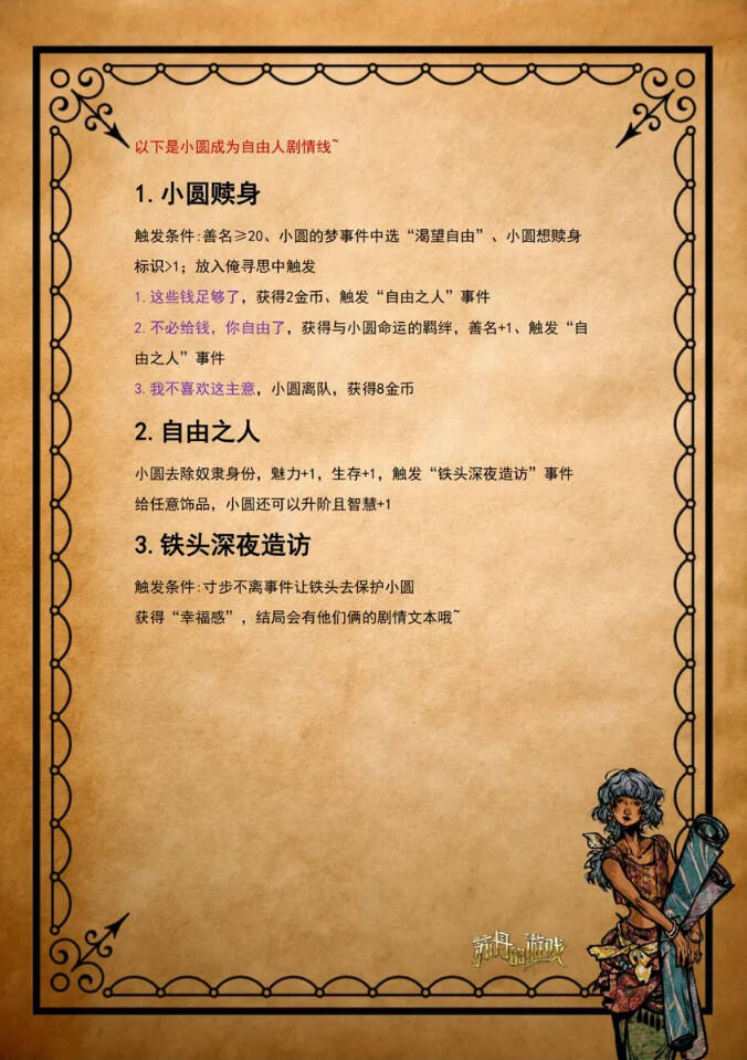 在游戏《小圆》中,苏丹的游戏小圆事件对玩家有一定的影响。具体来说,玩家与苏丹的互动将影响苏丹在游戏后期对玩家角色的支持度。 在游戏事件“小圆的忧郁”中,玩家有两个选择。第一个选择是鼓励苏丹继续制作游戏,这会增加苏丹对玩家的好感度;第二个选择是鼓励苏丹放弃制作游戏,这会降低苏丹对玩家的好感度。如果玩家在后续的剧情中表现出对苏丹的支持,如购买游戏或给予鼓励,那么苏丹会在最终战斗中为玩家角色提供增益。 然而,需要注意的是,这只是一种可能的影响,具体的影响可能因玩家的选择和行为而有所不同。此外,还有其他一些事件和角色互动也会对玩家的结局产生影响,玩家可以根据游戏攻略或教程来了解更多相关信息。 以上内容仅供参考,建议到相关游戏网站上查询或咨询游戏高手,以获取更全面和准确的信息。 苏丹的游戏中小圆作为事件人物之一,有着其专属的任务剧情,根据玩家的选项以及状态不同会触发不同的路线及事件结局,下面就为大家分享苏丹的游戏中小圆人物事件流程。 以下内容由小黑盒用户Evelyn999分享。 来噜来噜,今天给大家带来的是《苏丹的游戏》游戏中的你的奴仆小圆的个人全剧情攻略~ 结合关键流程、隐藏条件及注意事项整理而成,助你解锁她的专属剧情与结局: 娶小圆线: 这条线路可以娶小圆,但是没多久就会触发小圆和铁头私奔~这条线收益不太大哦 小圆被跟踪线: 该线路大致剧情就是一个贵族尾随小圆,可以派人保护她,最好派铁头啦,两小情侣,还可以解锁他俩的特殊结局剧情哦~ 小圆赎身线: 该线小圆将获得自由,可以与其建命运的羁绊,还可以给小圆升阶换立绘哦~ |