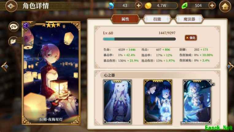 三、获取全部原谅石的条件 为了提高比宠爱量,攻略方式将会尽可能的使用一个c(输出)带两个辅助(工具人)的模式,而完成首通后的12个加成让c位变得更强,容易完成重复的刷取。因此输出的数量(体力)决定了能否获得全部原谅石。攻略13关至少需要13点c位体力,考虑到一些比较难以攻克的关卡使用双c(尽量避免三c情形),获取1820通常需要13-16点c位体力(无法在16点以内通关的需要提升输出或辅助的练度)。 特别注意:1号位出肉的猎肠者艾尔莎不算输出,睡衣艾米没克制输出较低,也许只能打打前几关。 (1)如果你有4个c(输出),共计6x4=24点c位体力,首次完成13个关卡后剩余8-11点体力,剩余平均比魔女宠爱量要达到1180/8(9,10,11)=147.5(131.1,118,107.3),第13关获得魔女的宠爱数量最多为130,得到如下结论:4c首次完成13关消耗c位体力必须小于等于14次,即最多能有一关使用双c阵容(一般为被克制或最后一关),要求玩家要拥有相对较高练度的c及与之匹配的单c阵容,所以只有4个c要谨慎开启梦魇难度(考虑到前12关过后每关所给的加成,对练度的要求并非是超高,只有4c的玩家并不是只有大佬才能过梦魇)。 根据7楼(@贝贝)的反馈和拉我入坑的朋友(@Derek)的实测,一些等级不高练度也不高的角色(比如一破60级的打劫三兄弟阿珍阿汉阿顿)能在前几关有不错的表现,能减少主力输出的体力消耗,使4c阵容更容易通过梦魇难度。贴一个朋友一破的灯拉属性,给4c的玩家作为参考,来确定是否开启梦魇难度大家可以看到这个灯拉还没二破,带龙纹手杖回1ap,练度较低,在3-7配合带戒指的猫娘菲莉丝和贝蒂(主要是保护灯拉),他的3-7敌人加成为警戒和庇佑(每个人遇到的敌人加成不同)。 (2)如果你有5个c(输出),共30点c位体力,首次完成剩余14-17点体力,剩余陪平均比魔女宠爱量要达到1180/14(15,16,17)=84.3(78.7,73.75,69.5),,剩余14点重复攻略3-9及以上关卡,剩余15、16点重复攻略3-8及以上关卡,剩余17点重复攻略3-7以上关卡,这是大多数玩家能够达到的情况,所以如果你 拥有5个c基本可以完成梦魇难度。 (3)有6个及以上c(输出)的玩家可以放心大胆的开启梦魇难度(过低练度如主线通关困难,集市副本困难者酌情考虑)。