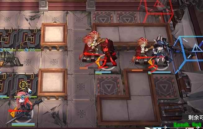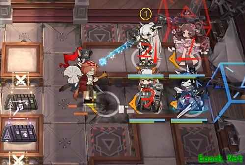 最后,如图所示部署:① 艾雅法拉(向左),② 闪灵(向下),③ 塞雷娅,挂机即可。
